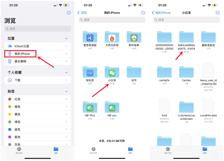 接下来把重新签名打包好的薇信安装到手机上,不管有没有覆盖,登录看一下如果聊天记录还在,那不用管了,如果聊天记录没了,那就来到 文件 app,找到新安装的 薇信 文件目录,把刚刚备份好的乱码文件夹拷贝到这个目录并覆盖,然后重启薇信就好了