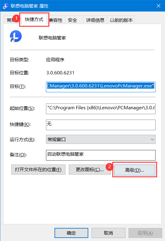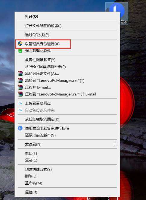 1、在需要设置的程序上单击右键,(下面以“联想电脑管家为例”)选择“属性”,如下图: