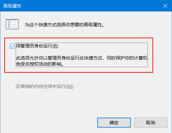 3、在“高级属性”界面勾选“以管理员身份运行”,点击确定,然后点击应用并确定即可。