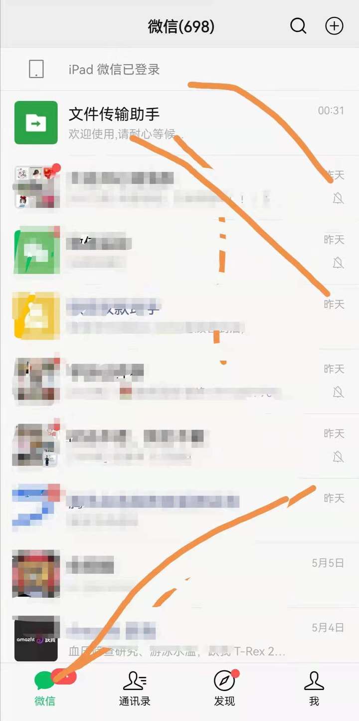如上图所示,扫码成功后在微信主界面会有一个iPad标记,然后到文件传输助手查看进度,如果没有iPad标记就重新再扫码一次,如果主界面没有文件传输助手,就自己右上角那个搜索框搜索添加一下文件传输助手。