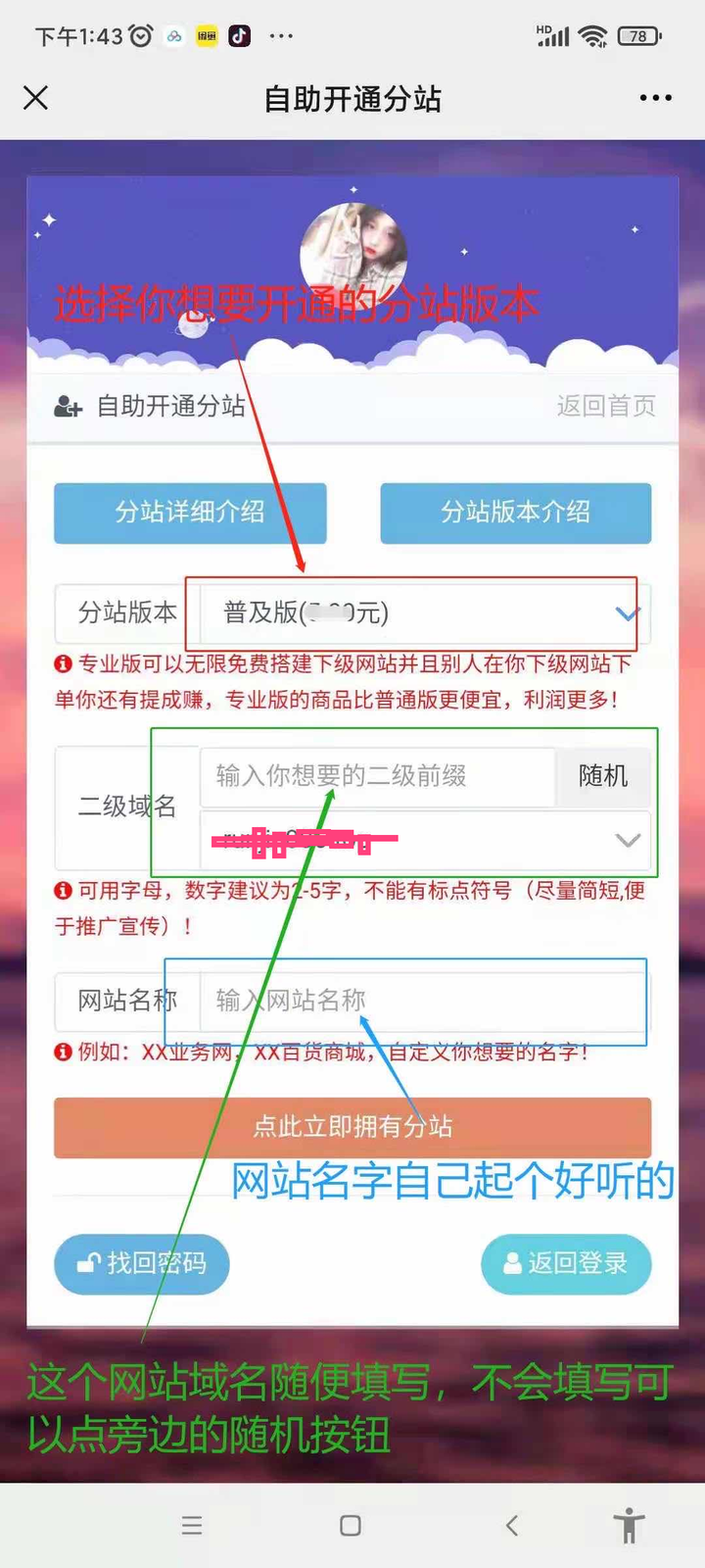 (2).进入到自动开通分站页面,按照开通分站的步骤填写并注册即可生成自己的分站商城
