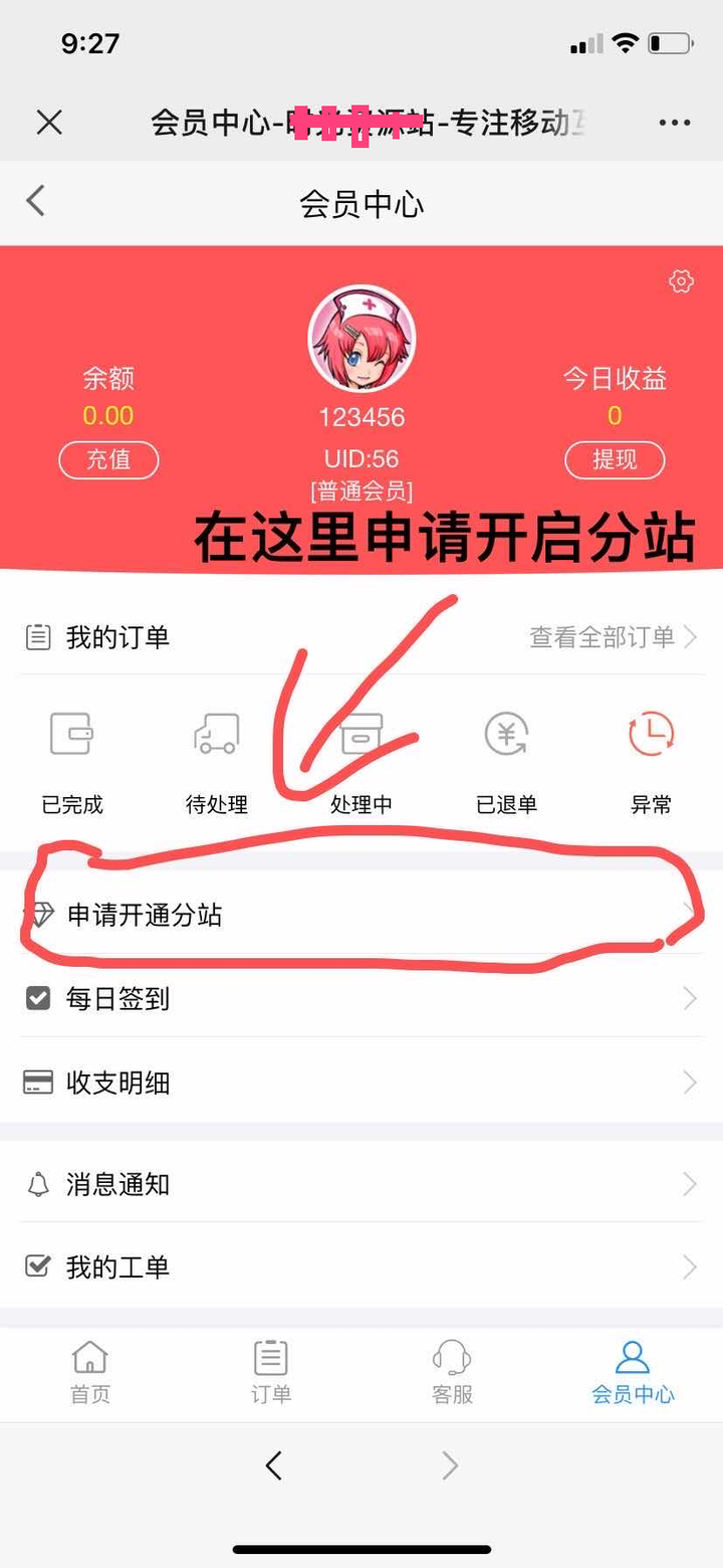 (1).进入平台注册以后就可以显示这个个人中心了,在个人中心有个申请开通分站功能按钮,