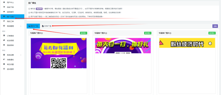 第一种:我们后台也推出默认生成的二维码界面来给旗下代理使用,只需要登录商城后台找到下面这个推广功能的按钮,点击进去就有我们自己的分站专属二维码。