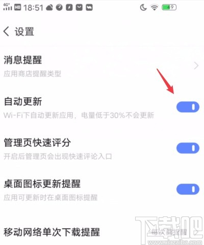 第五步:接下来下一步我们将这个功能的开关关闭掉就可以成功关闭自动更新应用的功能了(如图所示)。