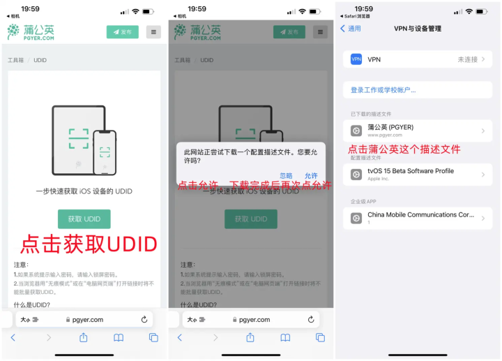 点击获取UDID 点允许 下载完成后再次点击允许 -点击蒲公英这个描述文件