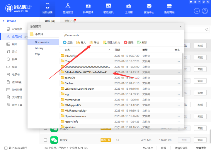 点击如上图所示微信「乱码文件夹」,注:此文件名称不是相同的,文件夹名字比较长,而且无规律,然后点击文件夹「导出」到电脑桌面。恢复聊天记录重新签名新的薇信多开正常安装以后,电脑爱思助手同样方法进入薇信浏览「Documents」文件下,导入备份好的聊天记录到此文件夹下!注:如导入前有相同文件夹名称,删除后再进行导入。