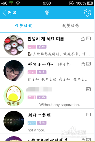 3、在赞的界面,右上角有设置按钮,点设置。
