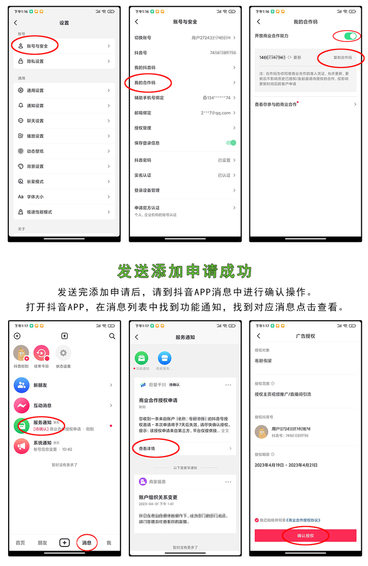 1:打开DY--消息--服务通知--商业合作授权申请--确认授权。